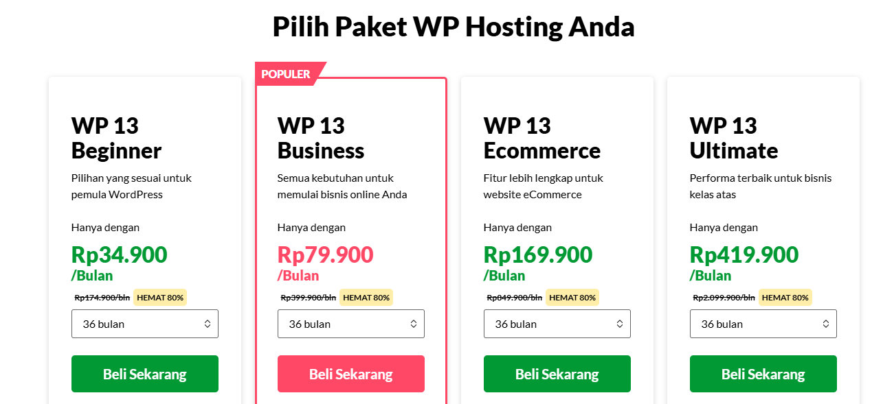 - WP 13 Ecommerce – Rp169.900/bulan: Pilihan ideal untuk toko online dengan fitur e-commerce.