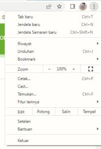 Pada halaman utama google chrome silahkan klik titik tiga di bagian pojok kanan atas, kemudian klik opsi Settings.