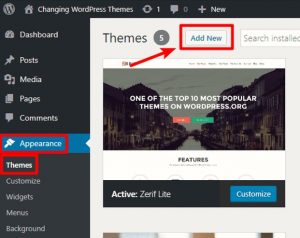 Untuk menggunakan tema download atau tema dari pihak ketiga ini sebenarnya hampir sama saja dengan cara mengganti tema yang disediakan wordpress yaitu cari dan klik “Appearance”, lalu “Theme”, kemudian “Add New”.