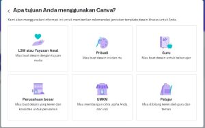 Setelah berhasil terdaftar dengan menggunakan Google maka pada tampilan pertama anda akan diminta untuk memilih alasan mengapa menggunakan canva, apakah untuk keperluan pendidikan, UMKM, perusahaan dan lainnya. Silahkan pilih salah satunya