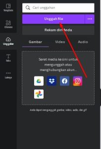Namun apabila anda tidak ingin menggunakan template, melainkan ingin melakukan editing gambar yang sudah ada seperti misalnya crop, penambahan tulisan atau lainnya, maka silahkan upload foto dengan cara seret foto ke halaman canva atau klik unggah file